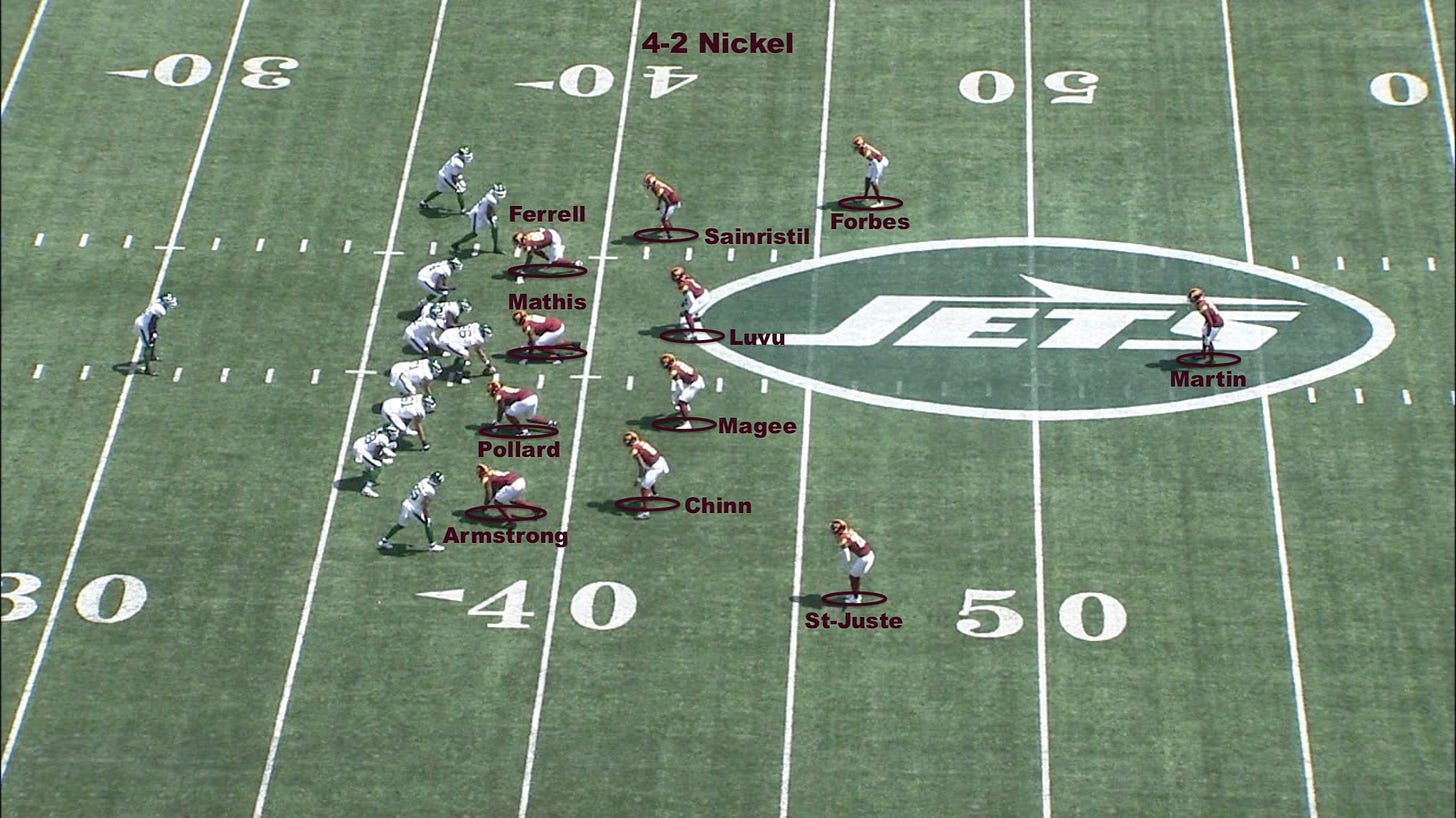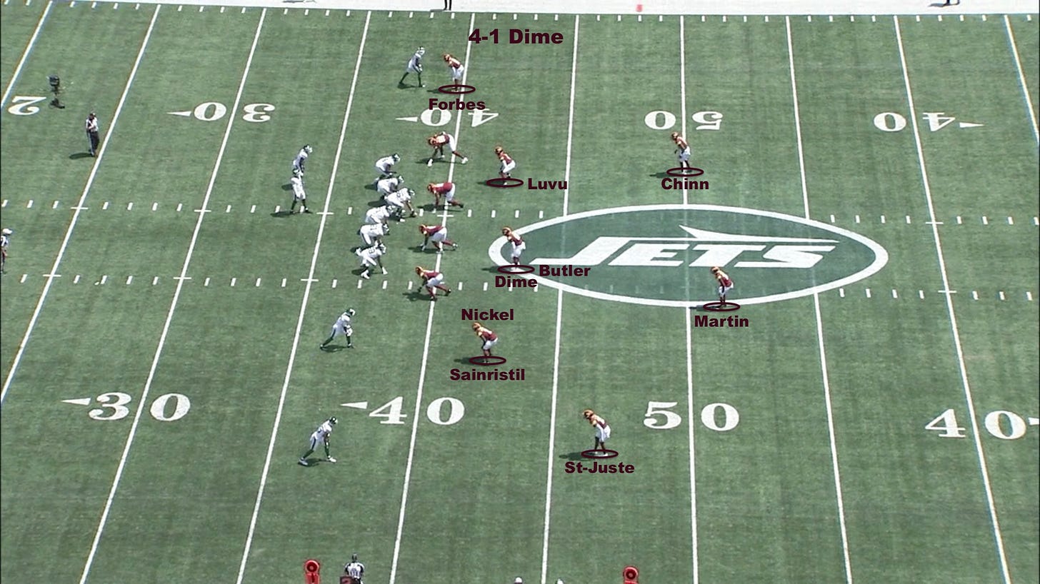 After a false start on second down got the Jets backed up into a second and nine situation, the Commanders quickly changed out of their 4-2 nickel package and shifted to their 4-1 dime package. This is a similar package but instead of having a second linebacker, they sub in an extra safety to play as a lighter, more agile dime linebacker.