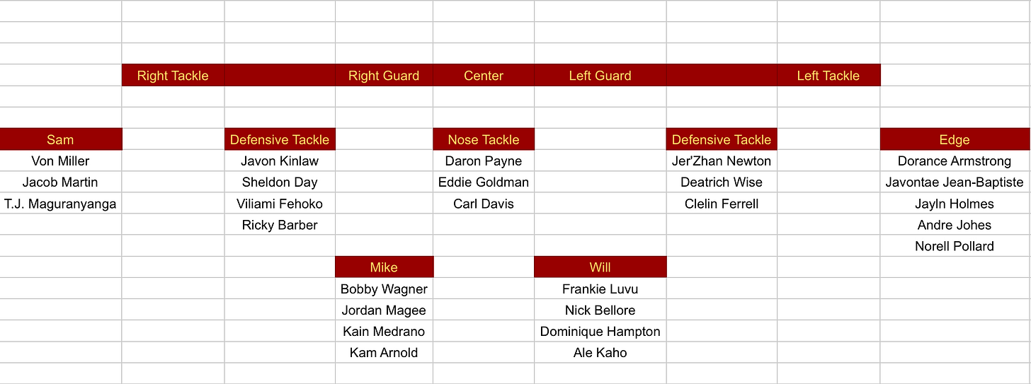 But the point of showing this front is to show the flexibility of the defensive lineman on the roster. The Commanders have so many defensive lineman capable of playing both inside and outside that they can depth for whatever fronts/alignments they want to use. Payne could easily be a 3-4 nose tackle, but he could also play one of the other interior spots. Newton played some nose tackle in these looks last year to get his quickness matched up on slow centers, but they went away from that later in the year. Eddie Goldman is more of a traditional nose tackle so he could come in to free up Payne for one of the other spots. I’ve got Wise and Ferrell listed inside here, but Armstrong and Jean-Baptiste could play that inside role too.