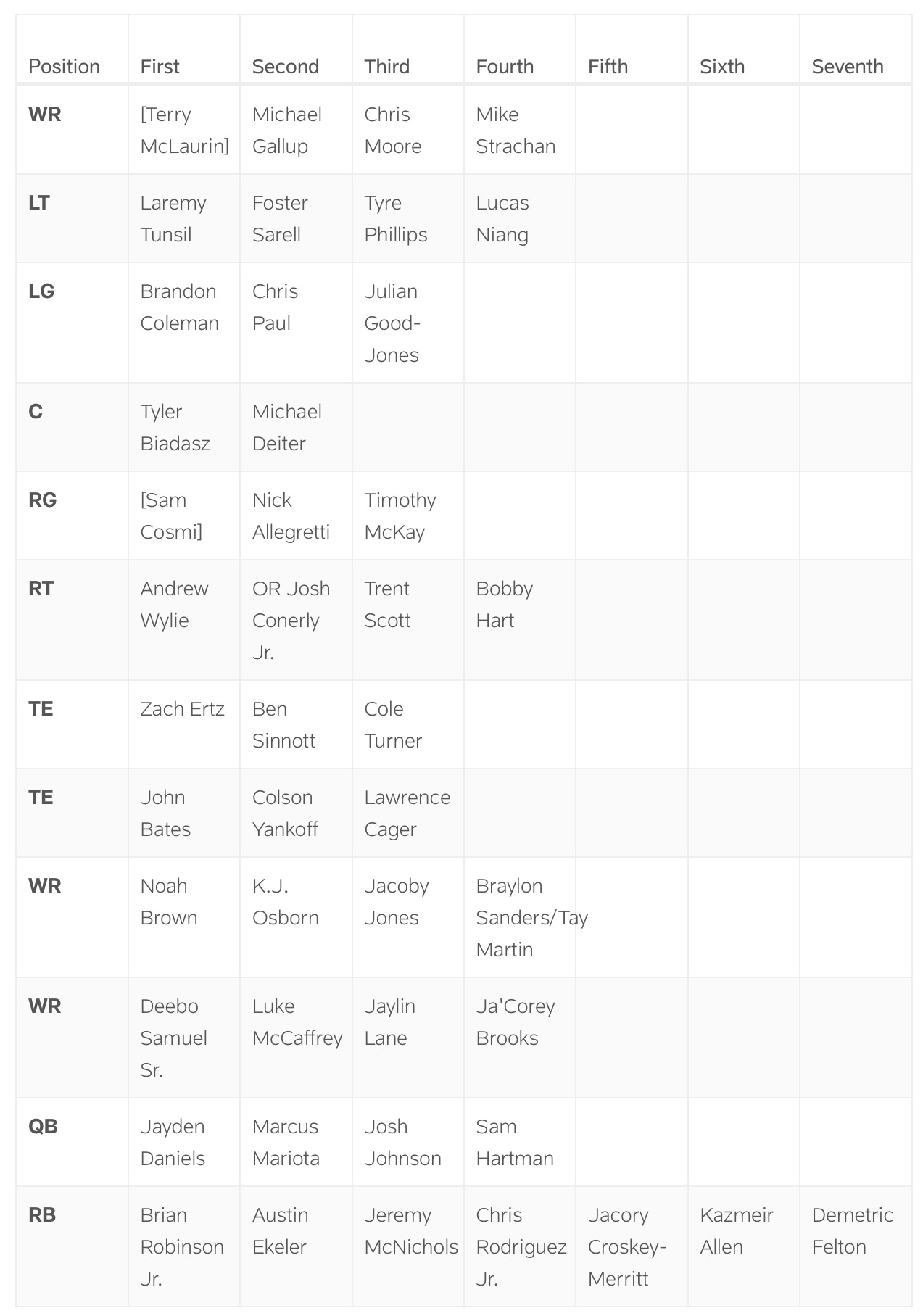 Tight end is also split into two categories. These are likely receiving tight ends and blocking tight ends. Zach Ertz is obviously the top receiving option while John Bates is the clear top blocking option. Ben Sinnott is listed as the primary back up to Ertz, which is encouraging. The Commanders didn’t get him many targets during his rookie year but coaches have praised him for his efforts this offseason. It will be interesting to see if he has sharpened up as a receiver and learned some nuances from sitting behind Ertz for a season.