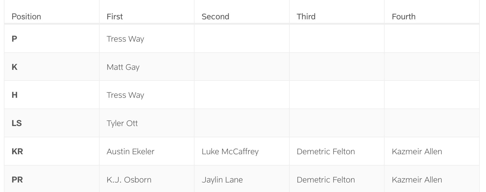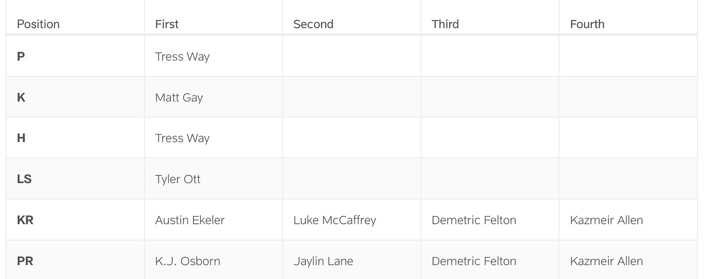 The three special teams positions aren’t in any sort of competition. Tress Way is the punter and Tyler Ott is the long snapper, both retained from last year. Matt Gay was quickly snapped up when he was released earlier this offseason and was given a pretty sizable contract, so he is their kicker. But the thing of note with the special teams chart is the returners.
